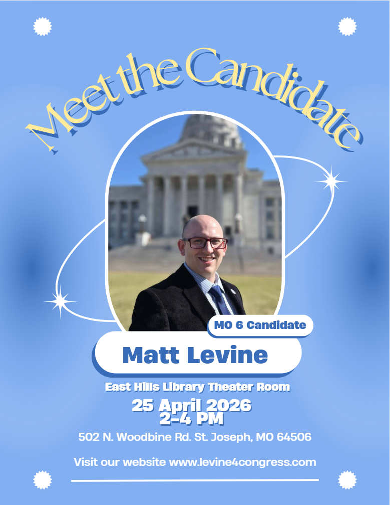 Want to meet Missouri Congressional District 6 Candidate Matt Levine? Now is your chance. First "Meet the Candidate Town Hall" will be held on Saturday, April 25th from 2-4 PM at the East Hills Library in St. Joseph, MO. We will be in the Theater Room for conversations about the vision for Missouri's District 6 and the constituents.