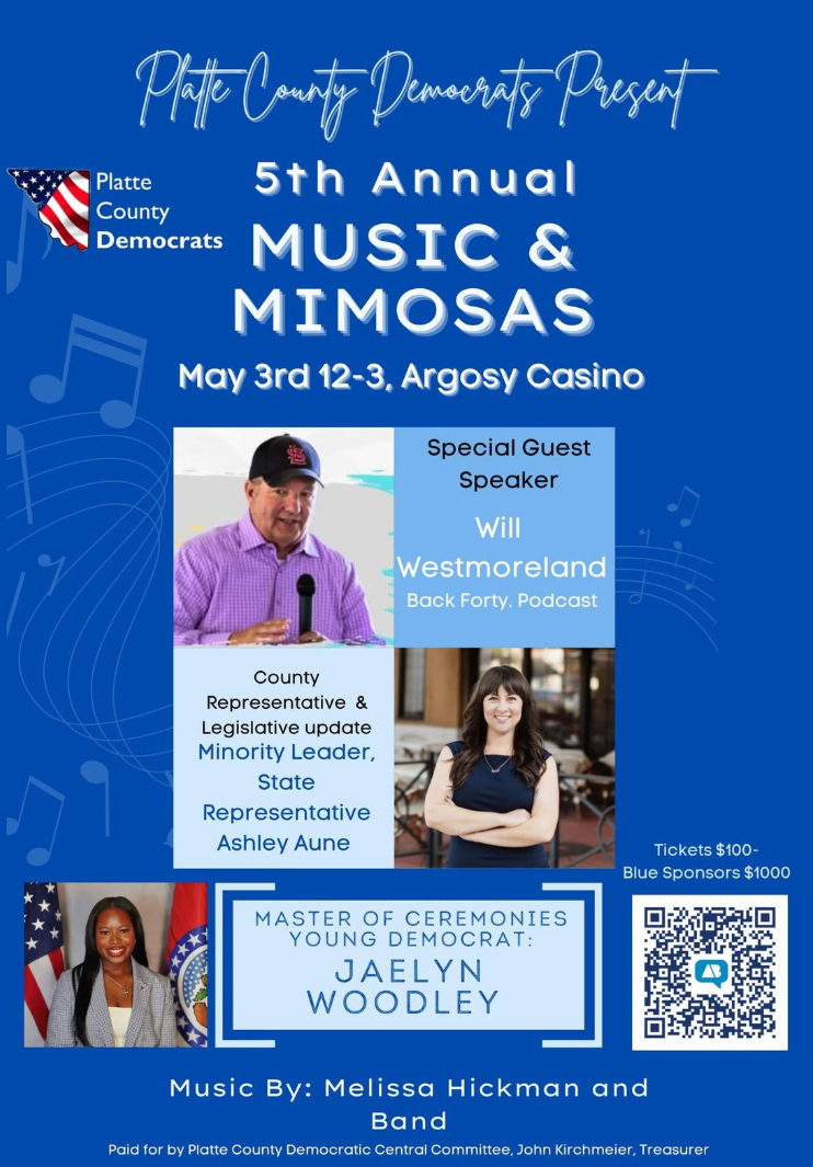 Join us on Sunday May 3rd 12-3PM @ Argosy Casino as we attend the 5th Annual Music & Mimosas Event in support of Platte County Democrats Central Committee. There will be a couple great speakers, Special Guest Will Westmoreland & our very own Minority Leader, Representative Ashley Aune. There will also be great music by Melissa Hickman and Band. Please come and support Platte County Democratic Central Committee and other local Democrats in our fight to flip Missouri blue.